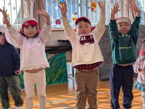 大きなホールで踊りの練習をしました。笑顔と大きな声でみんな踊れてましたね! 可愛い踊りを「もう一回♪」