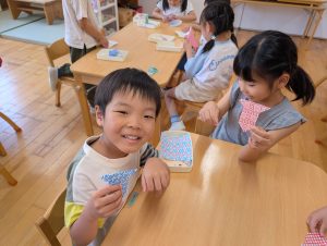 来月7日は七夕です。花園幼稚園のお友だちも笹の葉につける飾りを作っています。自分の好きな絵柄を選んで上手に作れました!