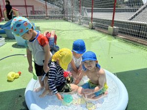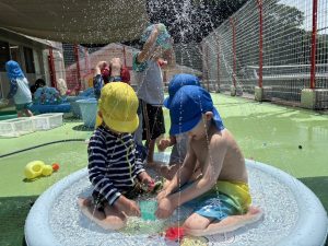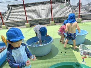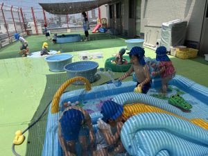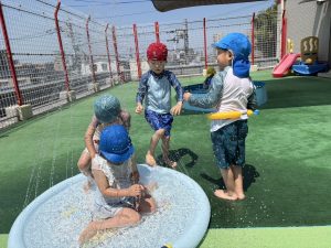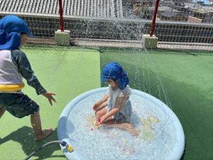 お外はとってもいい天気だったので屋上のテラスで水遊びを楽しみました!