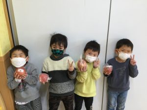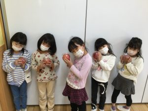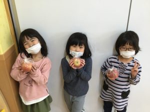 松山市中央卸売市場の方から幼稚園のみんなに食育の一環としてリンゴを頂きました。