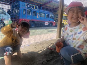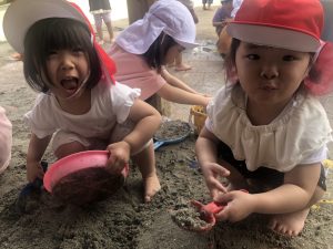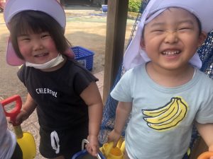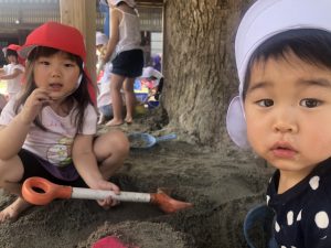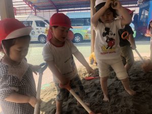 先週のお天気の日に年少組さんたちが園庭で砂場遊びをしました。