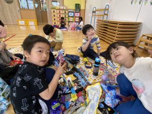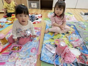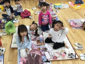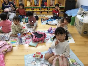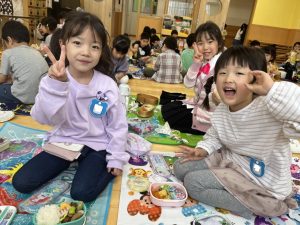 本日、幼稚園ではみんなで遠足ごっこをしました。おうちからお弁当を持ってきて昼食を楽しみました。いつもと違う雰囲気で笑顔いっぱいのお友だちでした。
