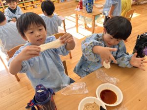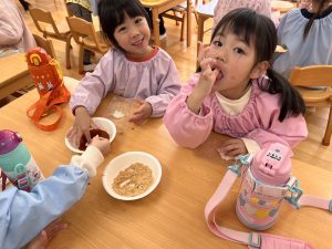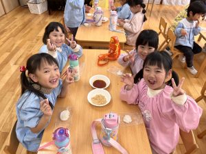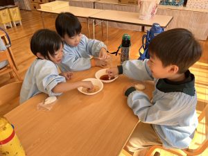 食いしん坊な、すずらん組さん 2023年12月5日 最終更新日時 : 2023年12月5日 waku1 11月に食育の一環でほくほくのさつまいもを食べる日がありました。 みんな大好きなさつまいも。「おかわりほしい!!」とすずらん組さん!お腹いっぱい食べてたね! また12月のお餅つきの日には自分たちのついたお餅を砂糖醤油やきな粉でおいしくいただきました! 自分たちのついたお餅はとってもおいしかったね!お餅をつくのもこれで3年目!!みんな上手に杵を使ってもちつきできたね♪ \ 最新情報をチェック /