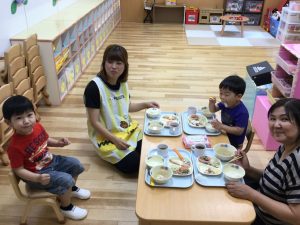 今日は園外保育で公園に遊びに行く日♪ ・・・だったのですが、お天気はあいにくの雨。 園外保育に行けず残念でしたが、 子ども達はとっても嬉しそうにお家からのお弁当を お友達と見せ合いっこしながら食べていました。