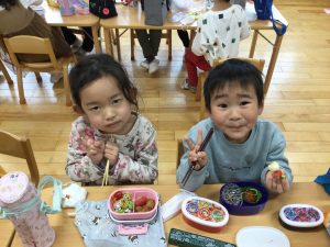 今日のお昼はみんなおいしそうにお弁当を食べていました。みんな残さず食べてたね!