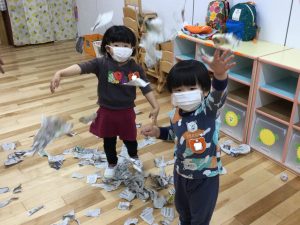 連日の雨で、お外で遊べないのでお部屋で新聞紙をちぎって「あめふりごっこ」を楽しみました。 新聞紙の雨は楽しいね! てるてる坊主も作ったよ!来週は晴れになりますように!