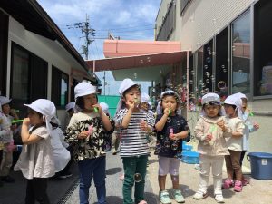 今日はお天気も良く年少組さんたちはお外でシャボン玉遊びをしました。たくさんシャボン玉を飛ばしたね。そのシャボン玉を追うお友だちもとっても楽しそうでした。また遊ぼうね!