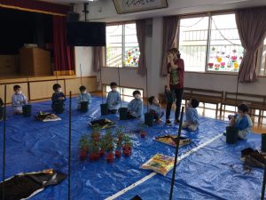 今日は年長児さんはトマトの苗植えをしました。あいにくの雨だったので、ホールで行いましたよ。 初めての苗植え。先生や運転手の方に手伝ってもらいながら、みんな上手に植えることができましたね。おいしいトマトができますように!