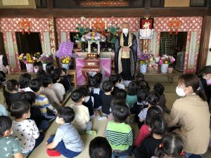 今日は1カ月遅れのはなまつりをしました。おうちからお花を持ってきていただいて、みんなでお釈迦様のお誕生日をお祝いしました。園長先生のお話を聞いたり、おはなまつりの由来を学んだり、般若心経を唱えたり楽しく過ごしました