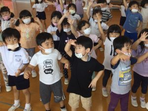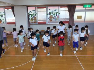 今日は年少組さんと2歳児、満3歳児クラスのお友だちがダンスの練習をしました!!一生懸命、先生を見ながら練習しています!!