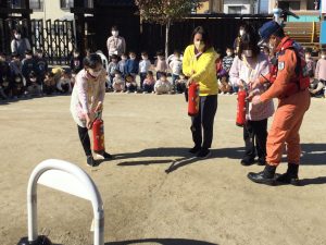 今日は火災時の避難訓練をしました。みんな毎月訓練をしているので上手にできましたね。 訓練の後先生方が消火の練習や、お友だちが隊員のかたに質問をしたりと 訓練の大切さを学びました。