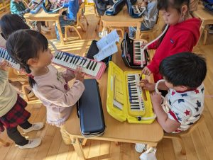 ひまわり組さんのお遊戯会の合奏の練習の様子です。保育室から流れてくるピアニカの音がとてもきれいです。これから劇の練習が始まるね!みんな、頑張っています!