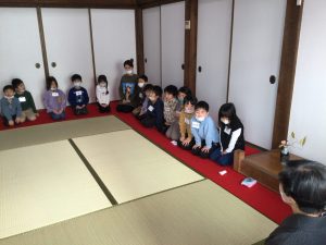年長さんは、今日、茶道のレッスンがありました。1学期、2学期のレッスンで、背筋を伸ばして正座もできるようになったしお辞儀も上手になりました。 年中さんは お外で凧揚げをしましたよ。一生懸命走って、凧をなびかせていました。