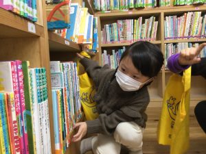 図書の貸し出しの日の様子です。図書室にはたくさんの本があって何を借りようかとお友だちは悩んでいます。この本も!あの本も読みたいと真剣に選ぶ姿がたくさん!!お家の人と一緒に読むのが楽しみだね!