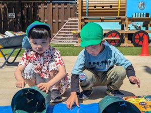 年長児さんは毎年トマトの苗植えを行っています。毎日水やりをしてトマトの実がなるまで観察しています。 今年はどんなおいしいトマトが育つのか楽しみです!