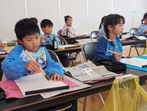 年長さんからお習字のレッスンが始まりました。初めての経験にみんな先生のお話をしっかり聞いてかけていましたね!