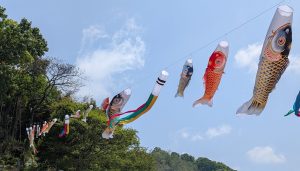 花園幼稚園の園庭にたくさんの色とりどりのこいのぼりが泳いでいます。今月の製作はこいのぼりをしています。こちらも色とりどりのこいのぼりがたっくさん!お家に持って帰るので楽しみにしていてくださいね!