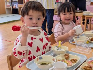 今日から通常保育の開始です。年少組さんの中には初めて給食を食べるお友だちがいます!今日はみんなの大好きな唐揚げ!!!にこにこ笑顔でほおばる年少組さんでした!
