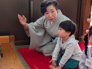 年中組さんは今日から茶道のレッスンが始まりました!畳の歩き方や、お辞儀の仕方・いろいろ学ぶことが多かった一日でした。 お茶菓子もまだ慣れないのか、不思議そうに食べていましたね!