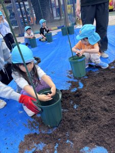 今日、年長児さんはトマトの苗植えをしました。みんな手を泥だらけにして楽しそうに!また、真剣に苗植えをしました!これから毎日水やりなどお世話をします。大きくおいしいトマトが作れますように!