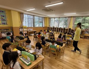 年中組のきく組さんは初めてピアニカのレッスンをしました。ホースに息を吹いたら音が鳴る。初めてピアニカを触ったお友だちは大興奮していました♪ これからどんどんいろんな音を出すのが楽しみです。