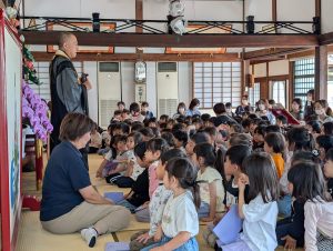 おはなまつりはお釈迦様の誕生日をお祝いする行事です。花園幼稚園のお友だちも今日は色とりどりのお花を持ってきてくれましたね。 本堂では般若心経を唱えたり紙芝居をみたりしてお釈迦様の誕生日をお祝いしました。