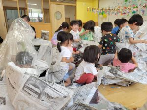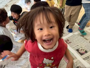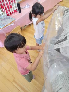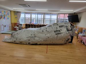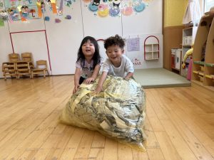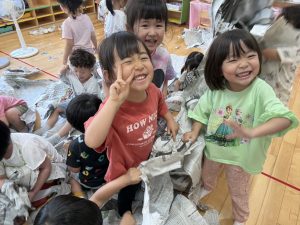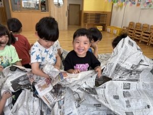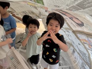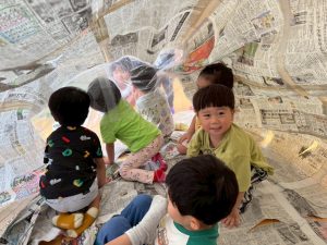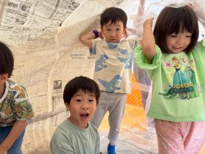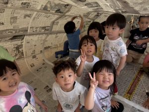 先生たちが大きな新聞ドームを作ってくれました!みんなドームの中でおおはしゃぎ!楽しかったね。