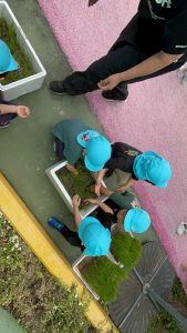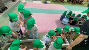 が、幼稚園でプチ田植え体験をしました。みんな手を泥だらけにして上手に苗を植えていましたね!