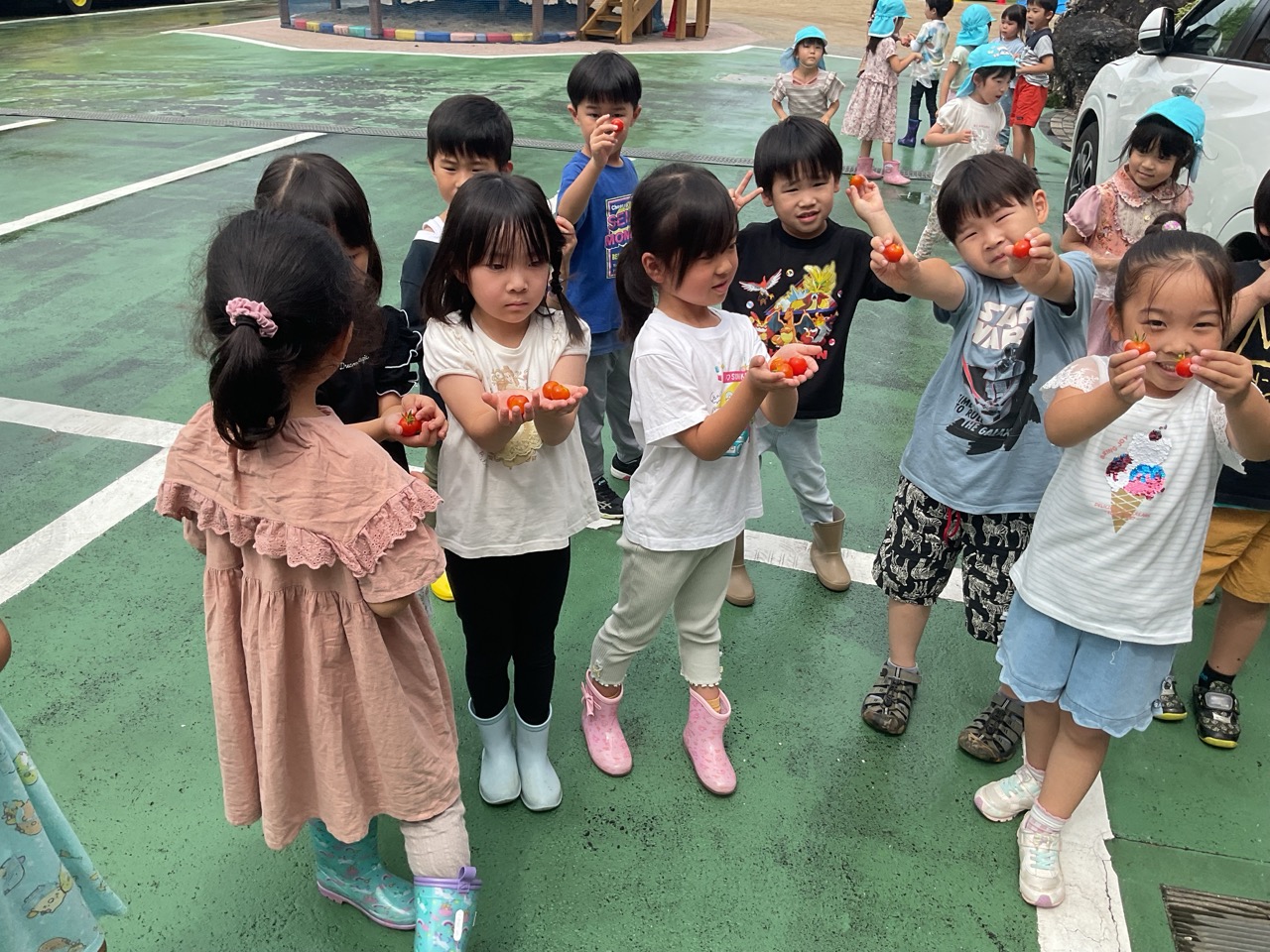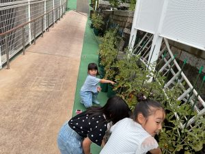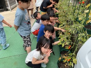 今朝トマトの苗を年長さんが見に行ったら、何と!たくさんの実がなっていました!みんなの嬉しい声があちらこちらから聞こえてきます!