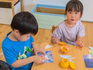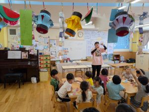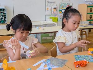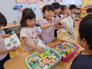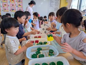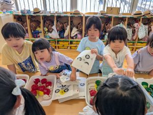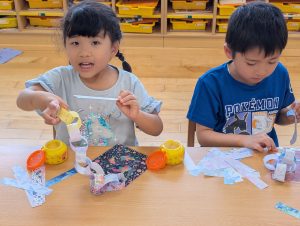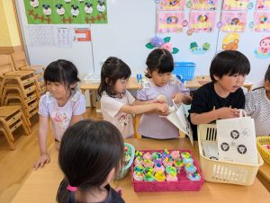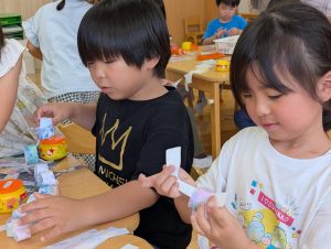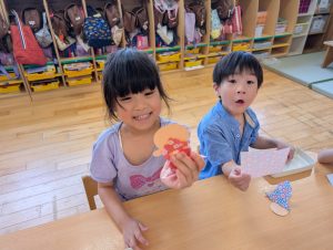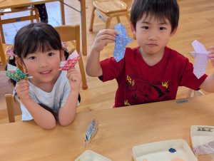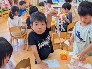 来月7日は七夕です。花園幼稚園のお友だちも笹の葉につける飾りを作っています。自分の好きな絵柄を選んで上手に作れました!