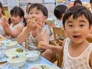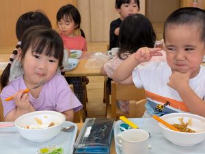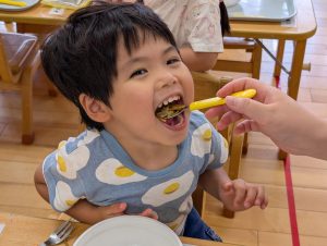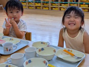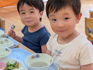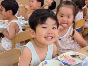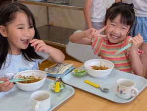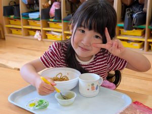 そのままTシャツを脱いで給食を頂きました。汗をかいた後の給食はおいしいね!