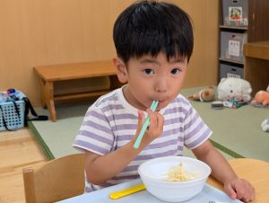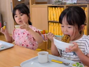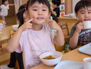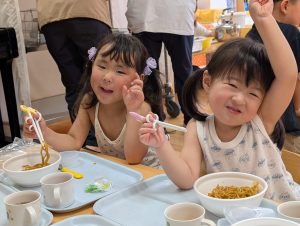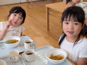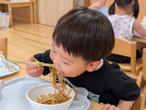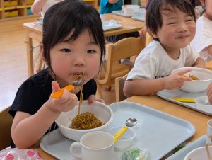 今日の給食は焼きそばです!みんなのおいしそうな笑顔が物語ってますね。